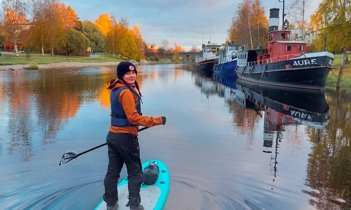 Me nappasimme SUP-laudat kainaloon ja päätimme lähteä vesille ihastelemaan tätä loppupään helmeä. Kellokallion laiturilta on helppo lähteä liikkeelle ja matkaa Hulkkion satamaan Päijänteen vesille tulee reilut 12 kilometriä. Reitti kätkee sisäänsä paljon erilaista nähtävää. Alkupään matkasta saa lipua ihastellen rehevää puustoa ja ruskan värejä sekä yli kulkevaa rautatiesiltaa. Pikkuhiljaa asutusta alkaa olla enemmän joen varrella, se kertoo siitä, että lähestymme keskusta-aluetta.
