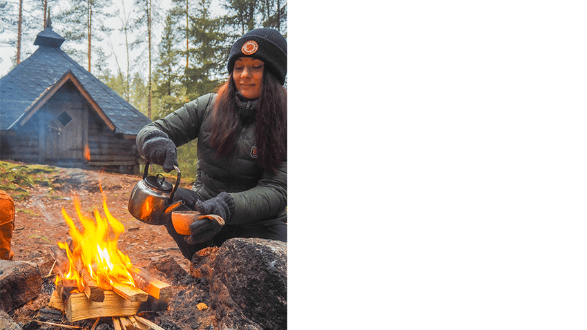 Matkan varrelta löytyy kota ja tulipaikka, jossa pääsemme nauttimaan yhdestä retkien kohokohdasta, hyvistä eväistä! Tänään pääsimme nauttimaan tulistelusta ja kunnon nokipannukahveista. Retkeillessä tulee muistaa, että aina tämä ei ole mahdollista. Retkeilijän on syytä seurata varsinkin keväällä ja kesällä voimassa olevia varoituksia, ja jättää tulet tekemättä ruohikko- ja metsäpalovaroitusten aikana. Onneksi on monta muutakin tapaa valmistaa eväät, kuin nuotio. Meillä usein kulkee mukana retkikeittimet, joilla saa näppärästi loihdittua jos jonkinlaista retkievästä. Myös ruokatermokseen saa retkieväät valmiiksi lämpimänä matkaan mukaan.