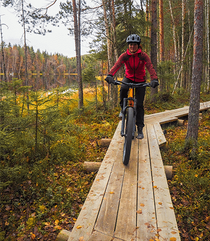 Sorvajärven luontoliikuntapolku on leveä murskepintainen MTB-reitti, jonne voi suunnata myös kävellen tai juosten. Reitti on hyvin monipuolinen kaikkine mäkineen, pitkospuineen, vauhtikaarteineen ja hyppyreineen. Haastavimmat paikat voi halutessaan kiertää, joten reitti soveltuu mainiosti myös aloitteleville pyöräilijöille. Me ajelemme tänään rauhallisesti fiilistellen, ohitamme muutaman iloisen lenkkeilijän, jotka ovat myös lähteneet nauttimaan syksyisestä ulkoilusta. Maastopyöräilyreittejä löydät esimerkiksi Bikeland-sivustolta.