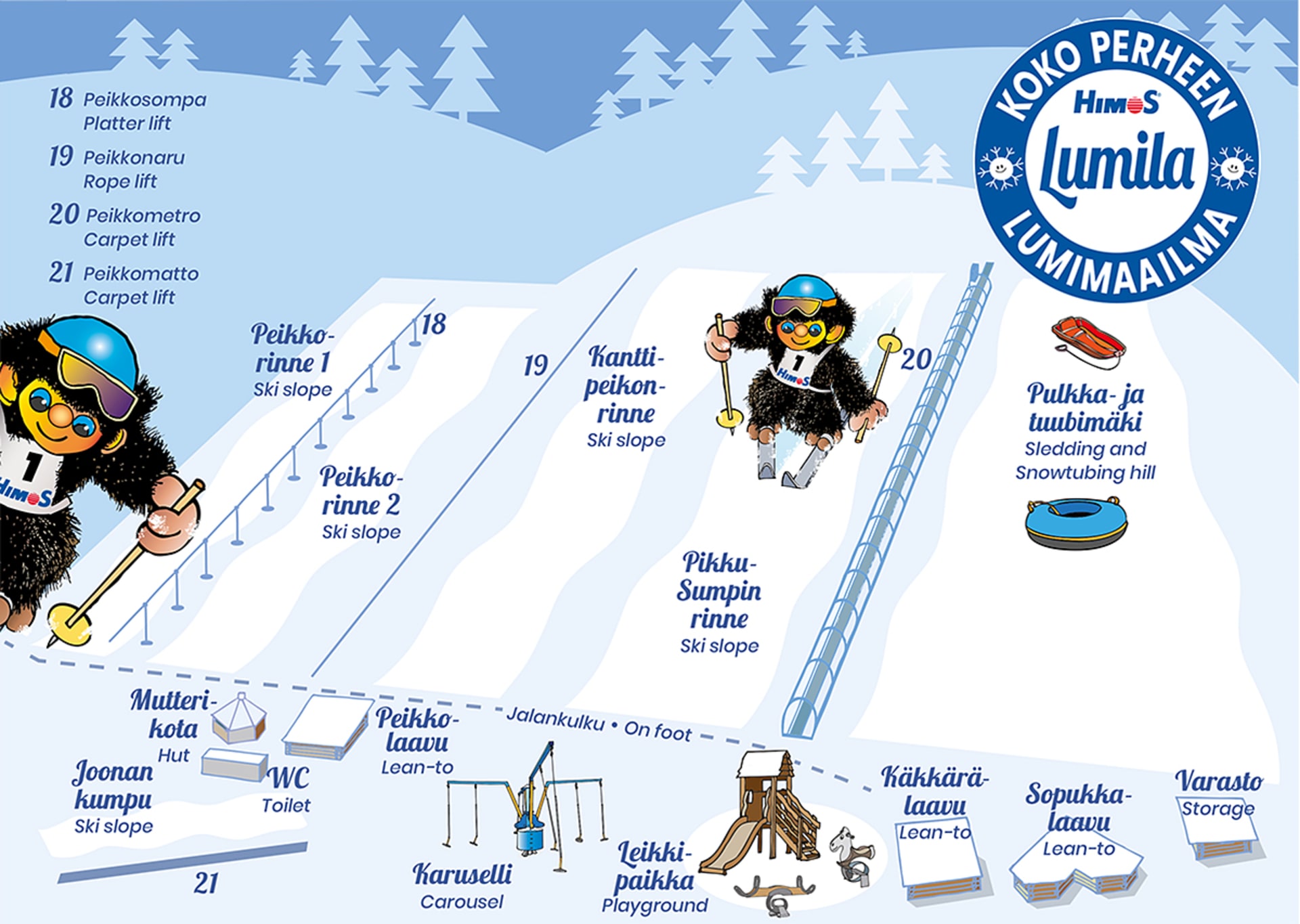 Noin kahden hehtaarin kokoisessa HimosLumilassa riittää puuhaa koko päiväksi! Alueella on neljä hissiä ja kuusi rinnettä laskettavaksi niin suksilla, lumilaudalla, pulkalla, rattikelkalla kuin tubing-renkaalla. Tunnelmallisilla laavuilla on mukava nauttia eväitä touhujen lomassa.