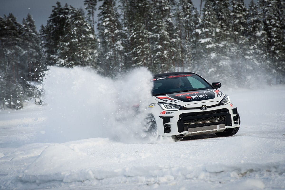 Kuski ajaa simulaattorimaailmassa rallia konepelti auki