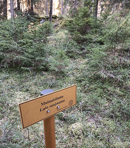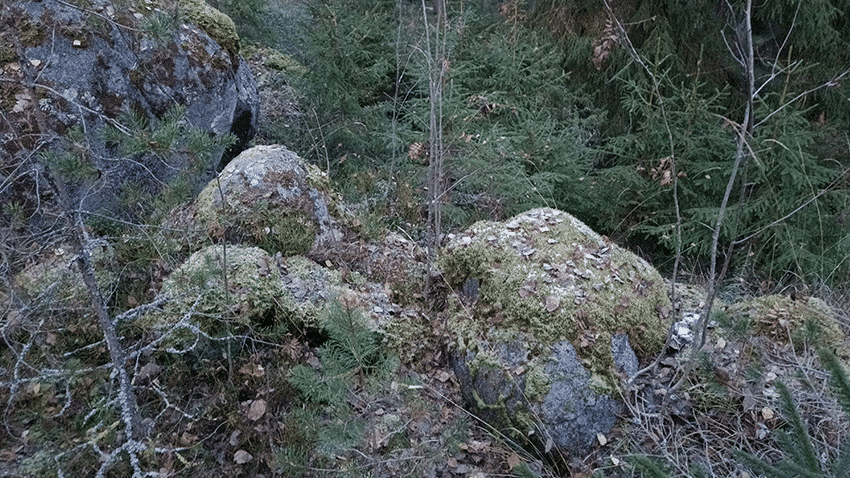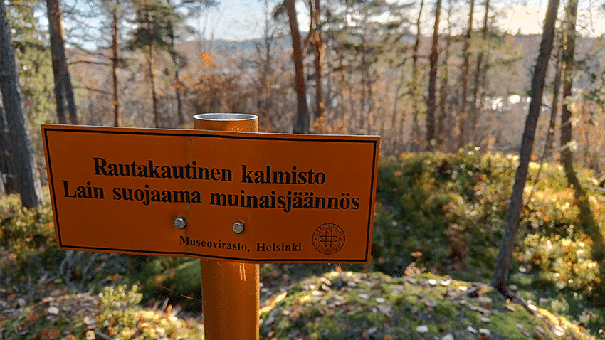 Jatkan hyväkuntoista polkua pitkin kapuamista kohti mäen lakea. Matkalla näen muutamia alueesta kertovia kylttejä lisää. Mielestäni Linnasenvuori sopiikin hyvin vaikkapa koululaisryhmille opintokäynnin kohteeksi. Juuri ennen lakea on opastetaulu, joka kertoo, että edessäni kallioterassin reunalla on vielä nähtävillä alkuperäisiä kivisiä puolustusvarustusten jäännöksiä. Innosta hehkuen nousen vielä muutaman metrin ylemmäs ja kas, siinähän niitä on pitkä rivi, itse asiassa arviolta 100 metrin matkalta. Niitä olisi varmaan enemmänkin, mutta muistitieto kertoo, että kiviä olisi käytetty ainakin 1800-luvulle asti talojen peruskivinä ja tulisijoja muurattaessa. Varustuksen puiset arkut ovat maatuneet jo aikoja sitten.