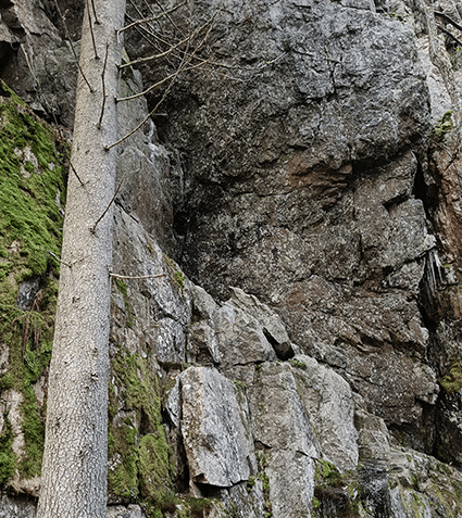 Synninlukkoon sisään astuessa kostea pienilmasto henkäilee vastaa. Rehevän rotkolaakson etenkin oikean puoleinen kuusen korkuinen jyrkkä kallioseinänä salpaa hengen. Kallion hyllyillä viihtyy keväällä pesivä viisas musta korppi. Huuhkajankin tekisi mieli samoille pesimäpaikoille, mutta sopu ei taida antaa sijaa.