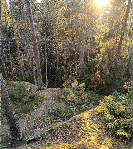 Rotkon perältä nousee polku ylös. Se seurailee rotkon reunaa ja ainakin minun pitää ottaa puun rungosta kiinni, kun kurkistan alas. Huikea näky, vatsanpohjassa tuntuu. Eikö tätä tunnetta kutsuta myös elämykseksi.